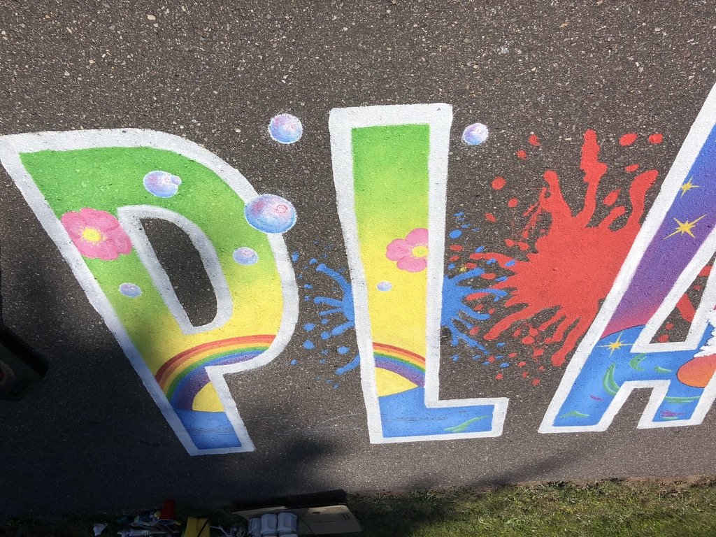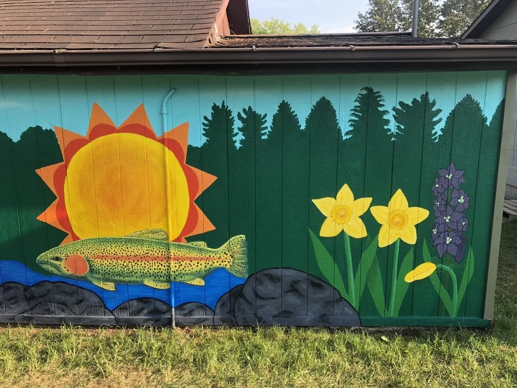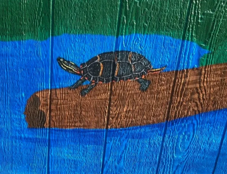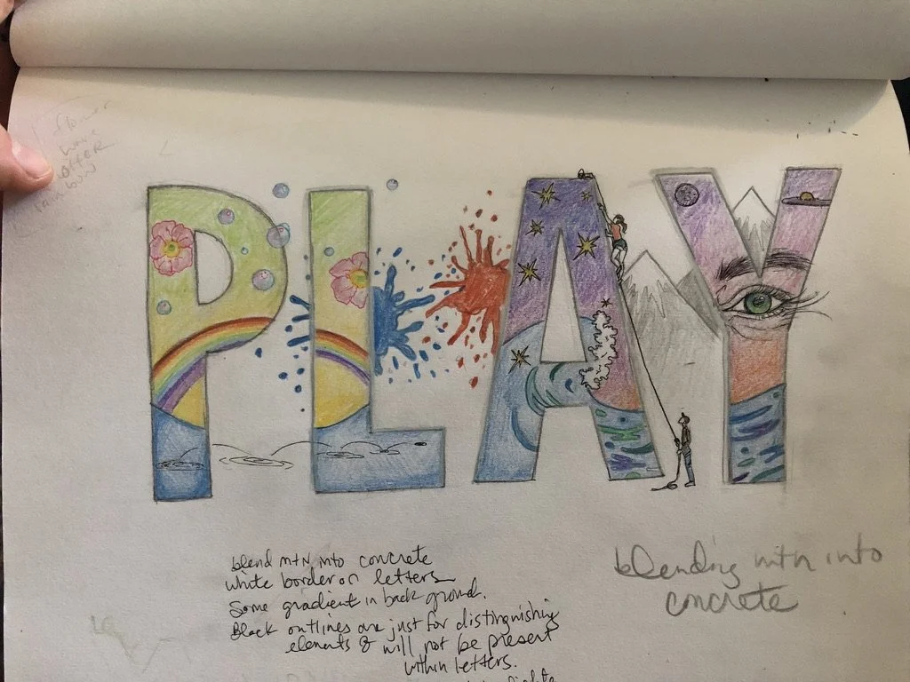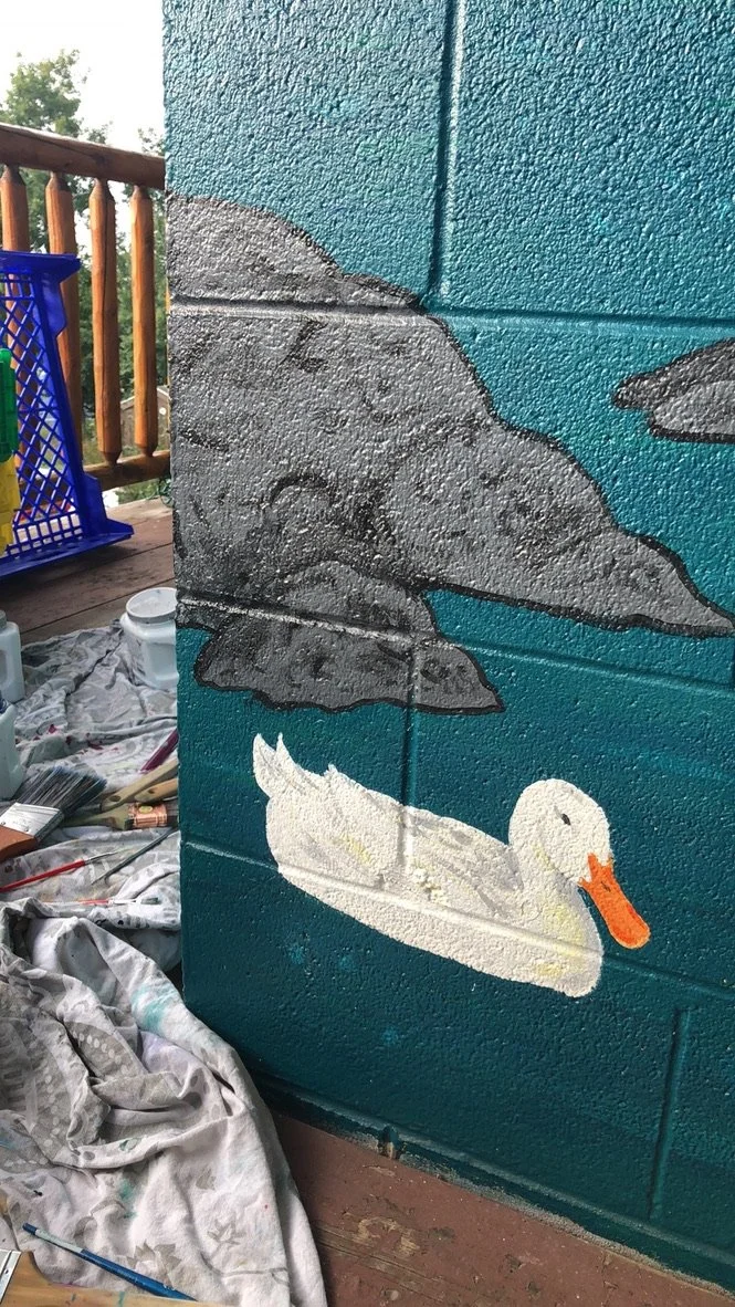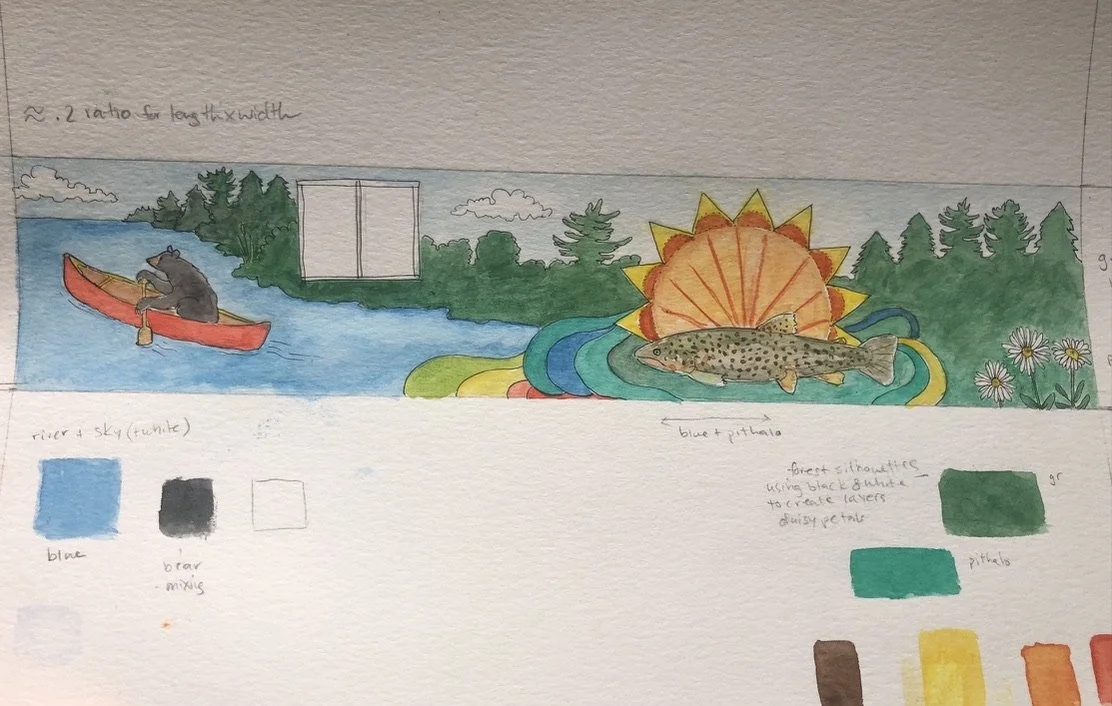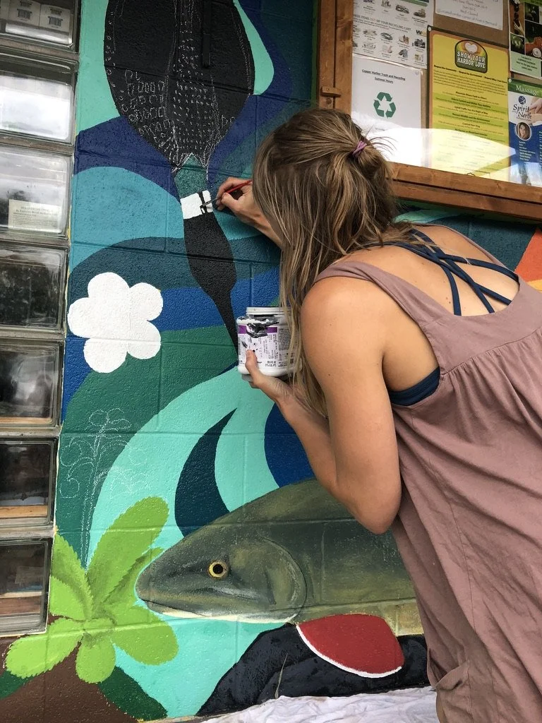 First I use chalk to draw the design on the wall. As the mural was coming to life, we opted for some changes in flowers (to have more familial meaning), adding a turtle, and changing the fish surrounds.
